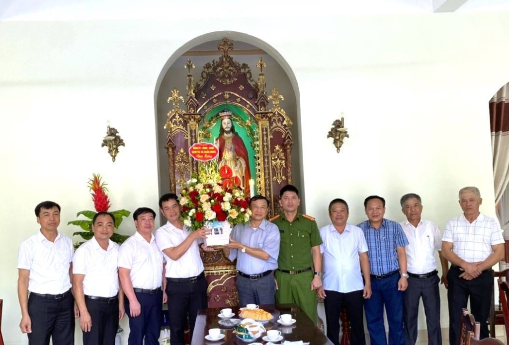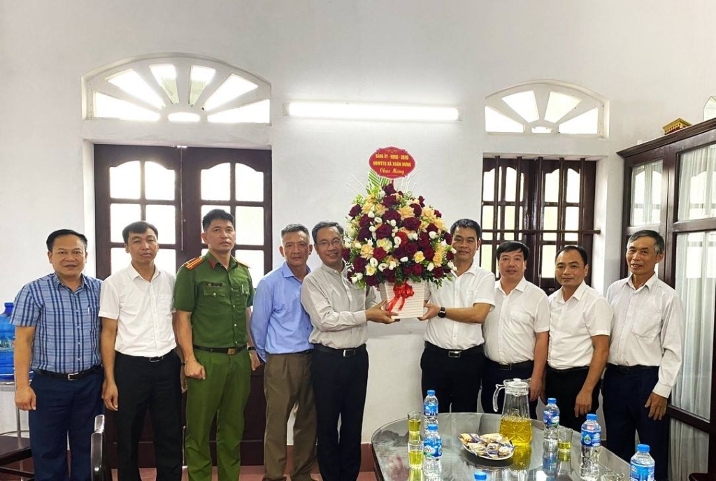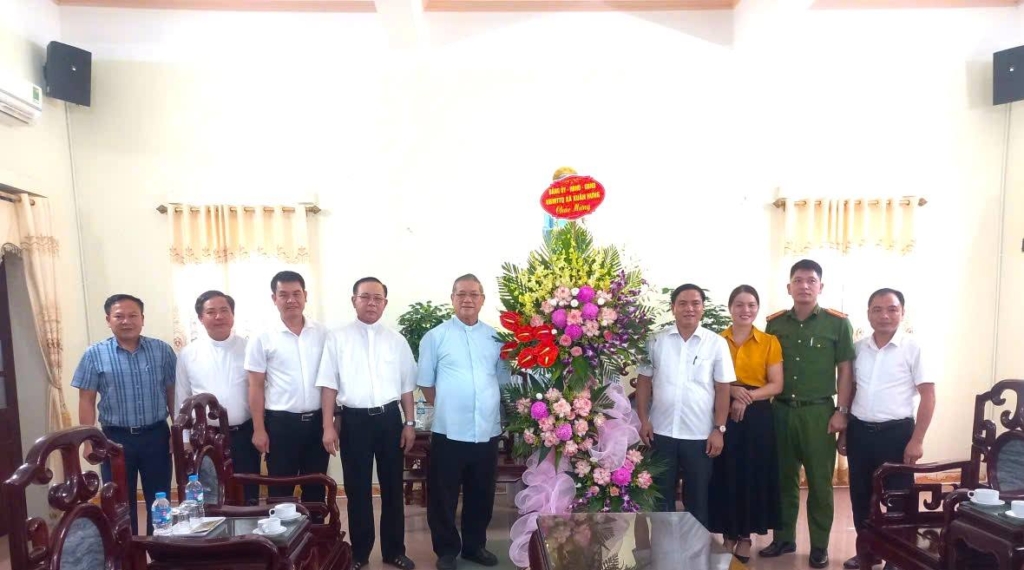 Các đồng chí lãnh đạo xã Xuân Hưng tặng hoa chúc mừng Giáo xứ Nam Điền