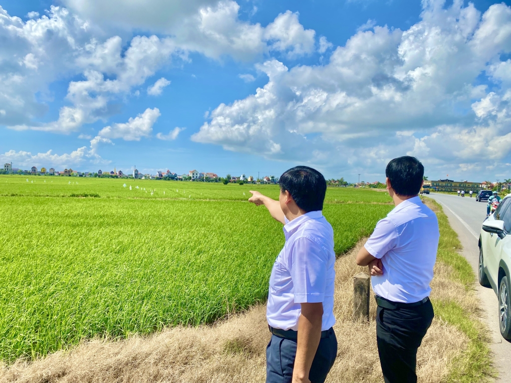 Đ/c Trần Văn Vỵ – Bí thư Đảng ủy, Chủ tịch HĐND xã và đ/c Vũ Trường Khánh – Phó Bí thư Đảng ủy, Chủ tịch UBND xã khảo sát thực tế mặt bằng để chỉ đạo công tác lập quy hoạch