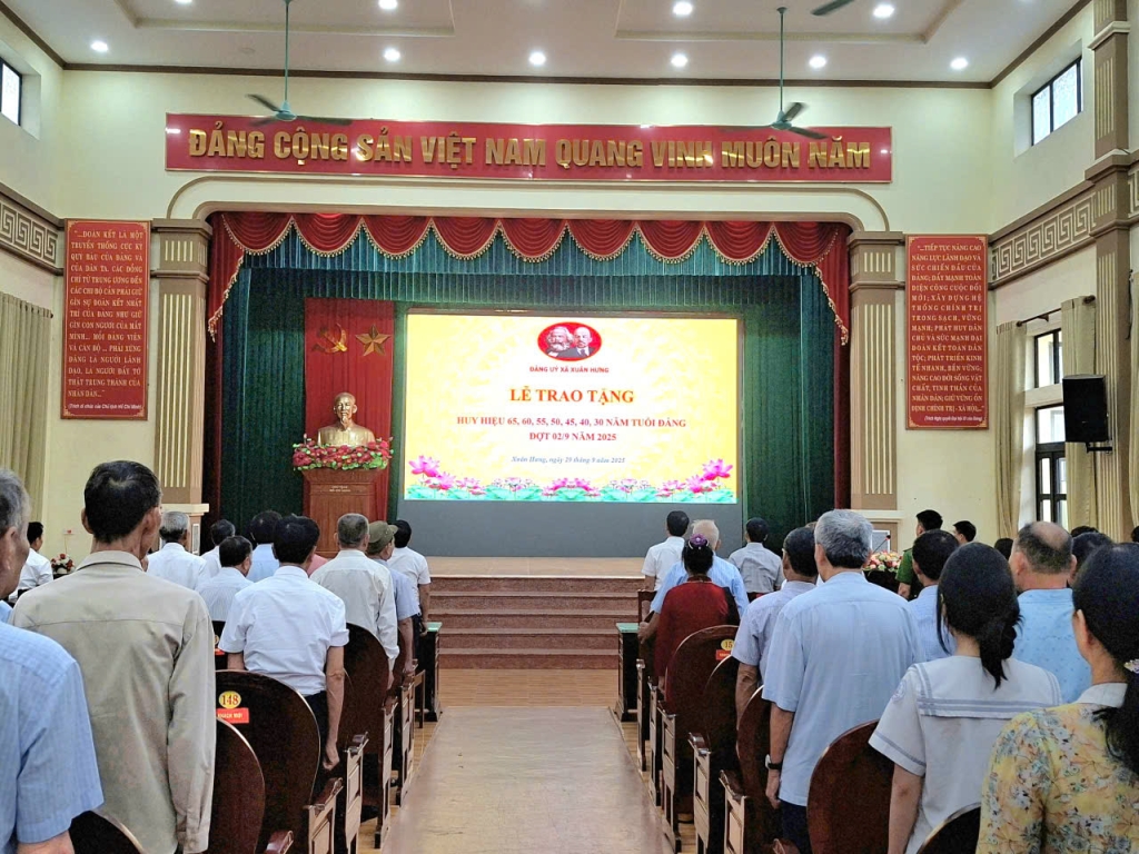Sáng ngày 26/9/2025, Đảng ủy xã Xuân Hưng long trọng tổ chức Lễ trao tặng Huy hiệu Đảng đợt 02/9 gắn với Hội nghị sơ kết nhiệm vụ chính trị Quý III, triển khai phương hướng nhiệm vụ Quý IV năm 2025. Về dự và chỉ đạo hội nghị có đồng chí Vũ Như Hải – Phó Trưởng phòng Dân vận các cơ quan nhà nước, dân tộc & tôn giáo, Ban Tuyên giáo & Dân vận Tỉnh ủy; đồng chí Trịnh Thị Thanh Như – Kiểm tra viên Phòng Nghiệp vụ II; đ/c Trần Văn Vỵ – Bí thư Đảng ủy, Chủ tịch HĐND xã; đ/c Bùi Thị Hồng Chiên – Phó Bí thư TT Đảng ủy xã; đ/c Vũ Trường Khánh – Phó Bí thư Đảng ủy, Chủ tịch UBND xã; các đ/c Ủy viên Ban Thường vụ Đảng ủy, Ban Chấp hành Đảng bộ, Bí thư chi bộ, trưởng các xóm. Đặc biệt, sự hiện diện của các đảng viên được vinh dự nhận Huy hiệu Đảng đã làm cho buổi lễ thêm phần trang nghiêm, xúc động.