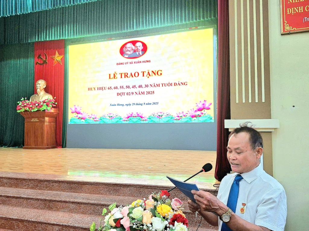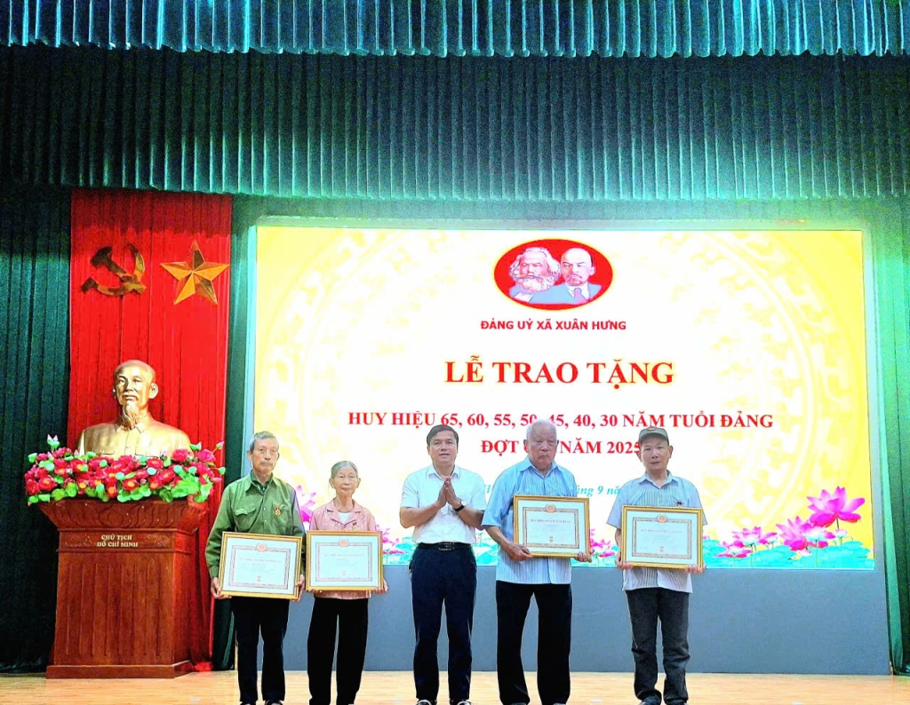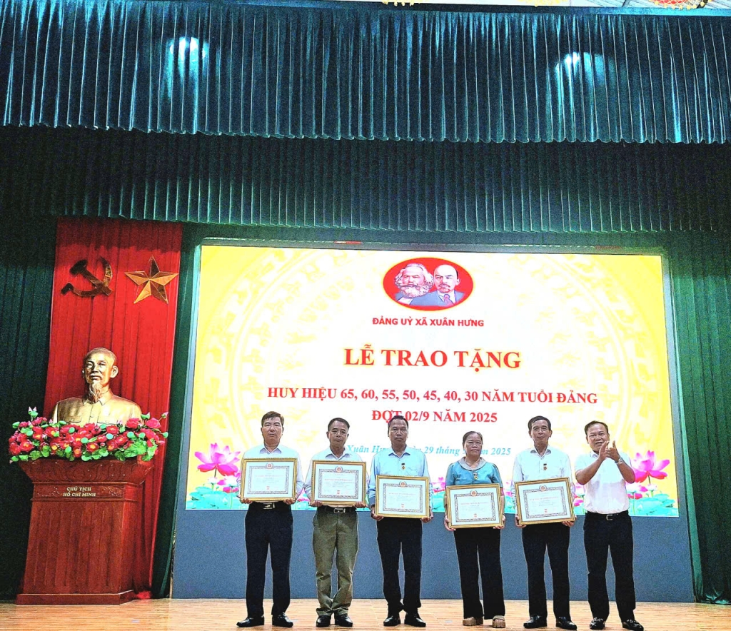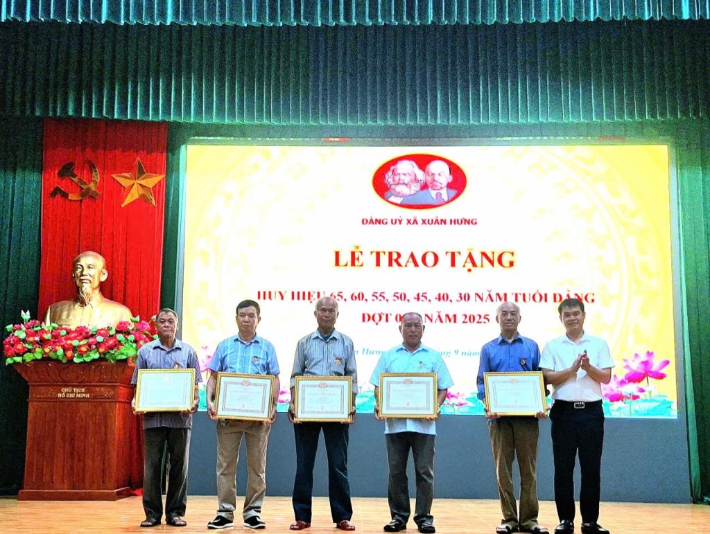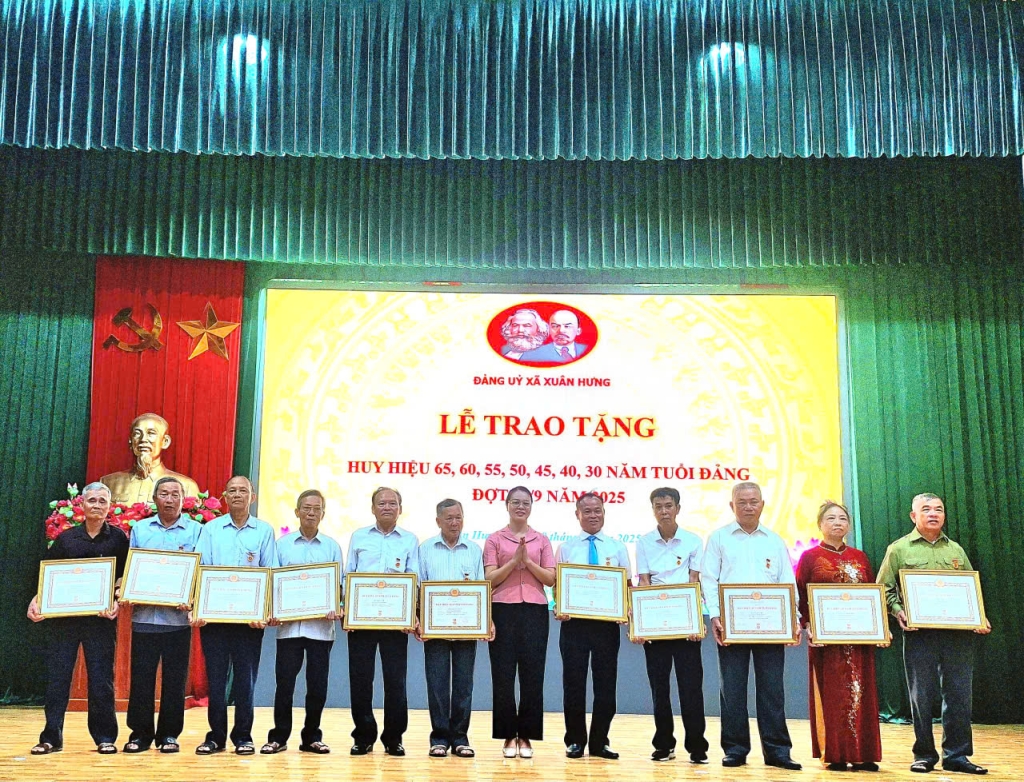 Đợt này, Đảng bộ xã Xuân Hưng vinh dự có 48 đồng chí đảng viên được trao tặng Huy hiệu 65, 60, 55, 50, 45, 40 và 30 năm tuổi Đảng. Đây là phần thưởng cao quý của Đảng, thể hiện sự ghi nhận và trân trọng đối với quá trình cống hiến bền bỉ, trung kiên của các đồng chí trong sự nghiệp cách mạng. Niềm vinh dự ấy không chỉ thuộc về cá nhân các đảng viên được tôn vinh mà còn là niềm tự hào chung của toàn Đảng bộ, đồng thời là động lực thôi thúc các thế hệ cán bộ, đảng viên trẻ tiếp tục tu dưỡng, rèn luyện, phấn đấu xứng đáng với niềm tin yêu của Đảng và Nhân dân.