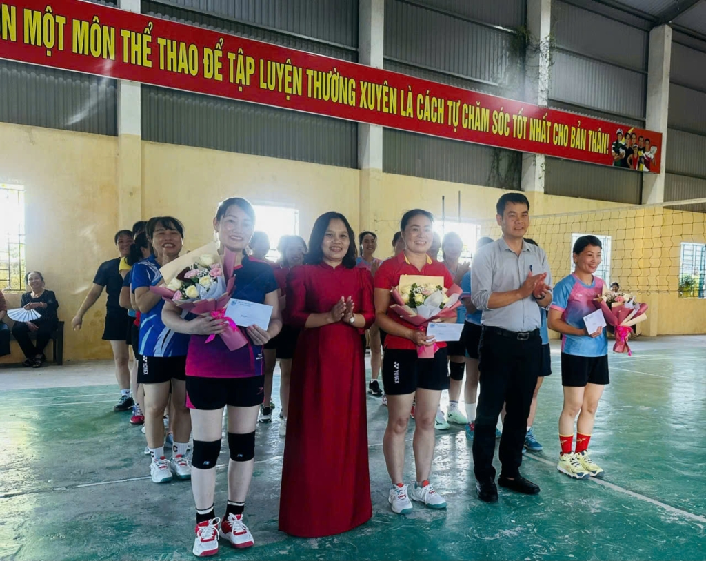 Đ/c Chủ tịch UBND xã tặng hoa động viên các đội tham gia giao hữu bóng chuyền hơi