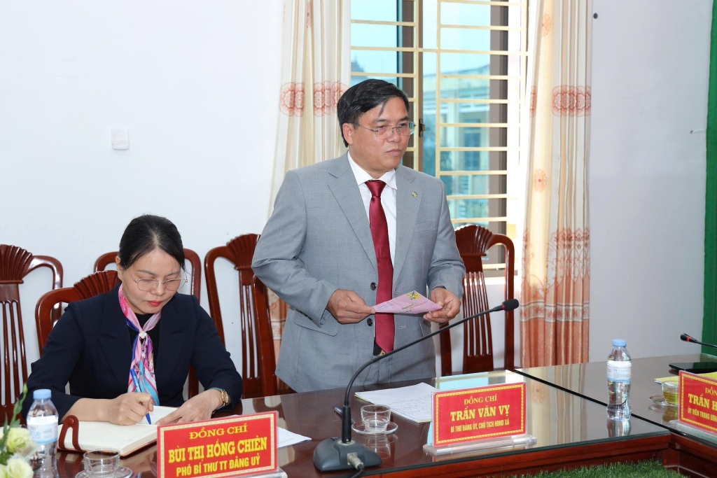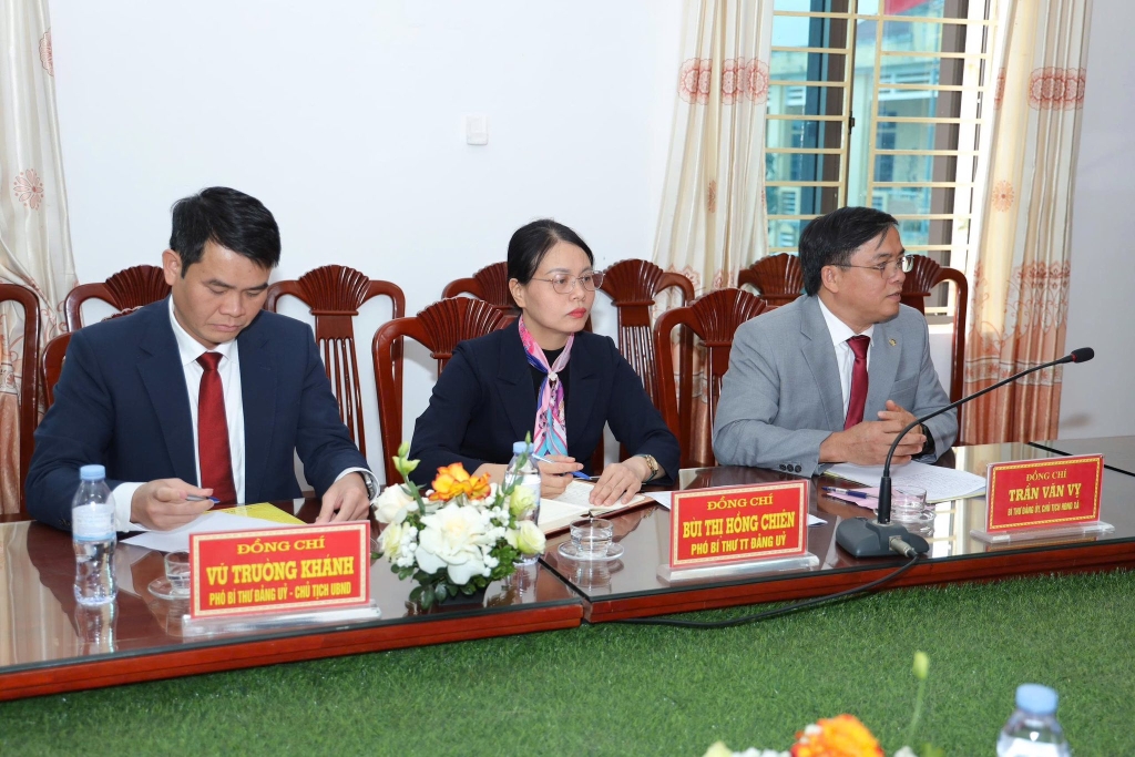 Tham gia Đoàn công tác có đồng chí Lê Quốc Chỉnh – Phó Bí thư Tỉnh ủy, Chủ tịch HĐND tỉnh; đồng chí Phạm Duy Hưng – Ủy viên Ban Thường vụ Tỉnh ủy, Chánh Văn phòng Tỉnh ủy cùng lãnh đạo Văn phòng Tỉnh ủy, Văn phòng Đoàn ĐBQH và HĐND tỉnh. Đón tiếp và làm việc với Đoàn có đồng chí Trần Văn Vỵ – Bí thư Đảng ủy, Chủ tịch HĐND xã; đồng chí Bùi Thị Hồng Chiên – Phó Bí thư Thường trực Đảng ủy; đồng chí Vũ Trường Khánh – Phó Bí thư Đảng ủy, Chủ tịch UBND xã cùng các đồng chí Ủy viên Ban Thường vụ Đảng ủy, lãnh đạo Văn phòng Đảng ủy, Văn phòng HĐND – UBND, phòng Văn hóa – Xã hội của xã.